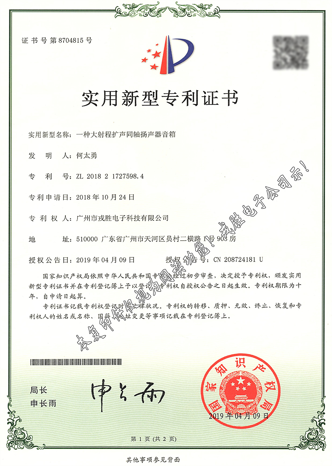 实用新型专利证书