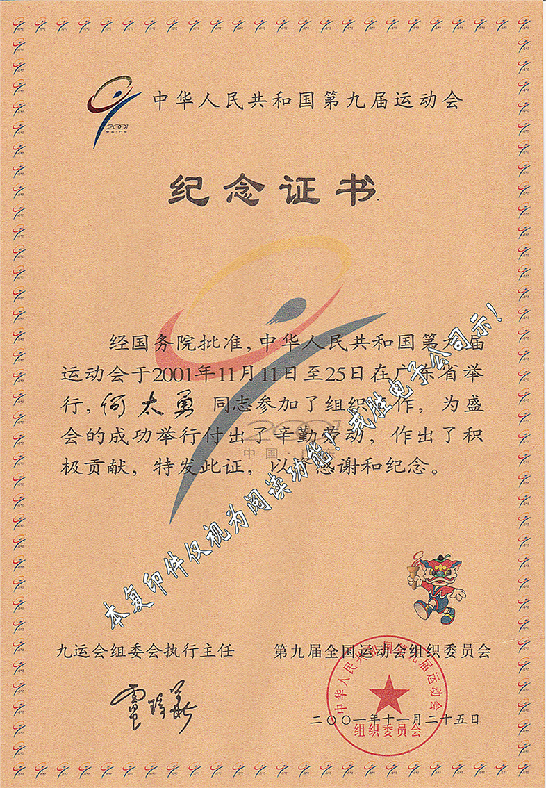 2001年荣获中华人民共和国第九届运动会组委会颁发的个人荣誉纪念证书。