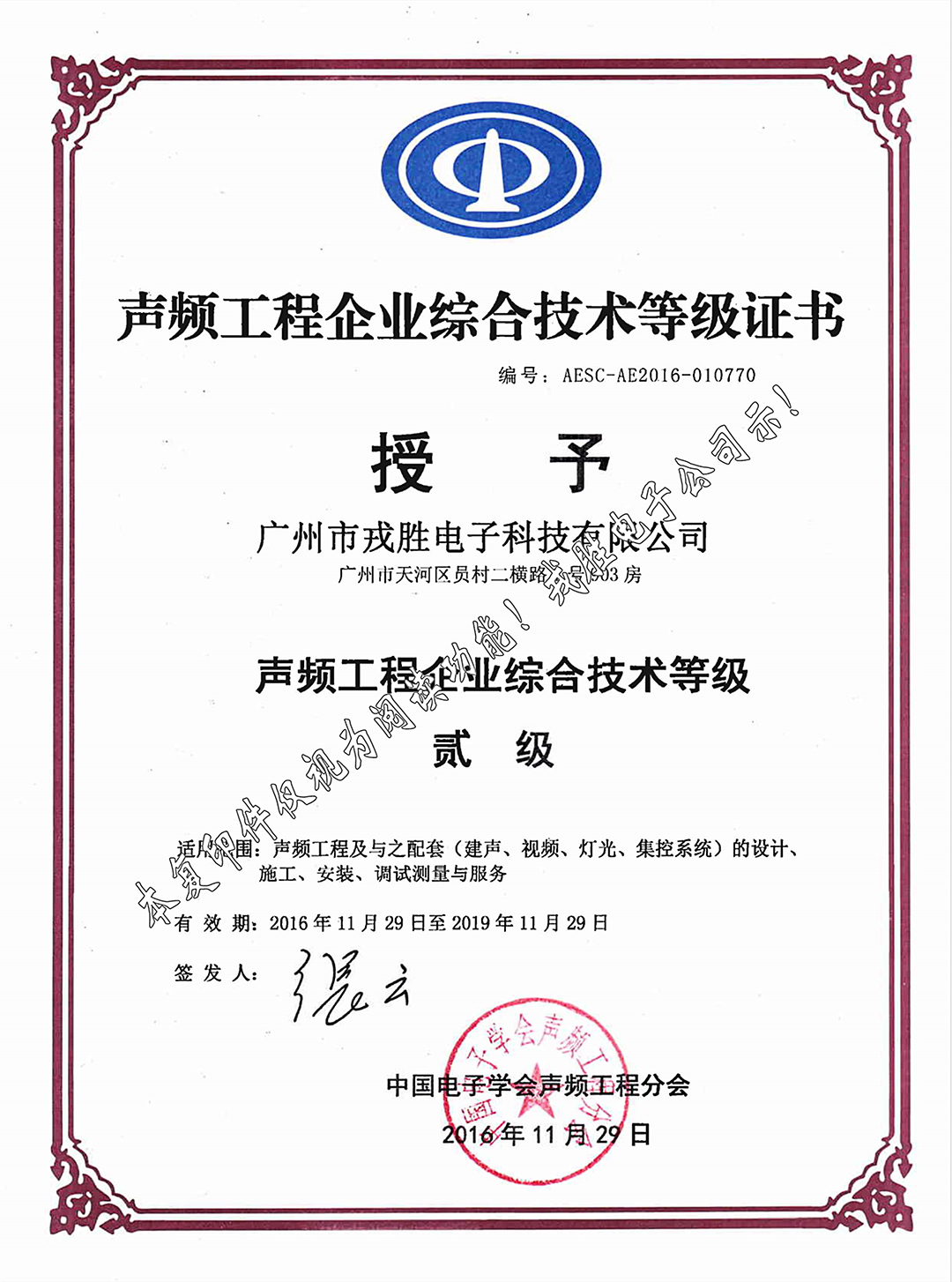 2016年11月29日,中国电子学会声频工程分会授予我司声频工程企业综合技术等级——贰级 资质证书;适用范围:声频工程及与之配套(建声、视频、灯光、集控系统)的设计、施工、安装、调试测量与服务。