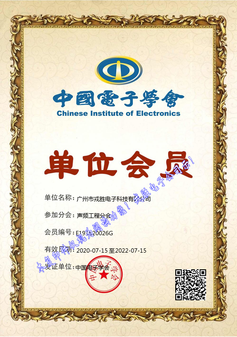 2020年7月15日,中国电子学会授予我司中国电子学会——声频工程分会会员单位证书。